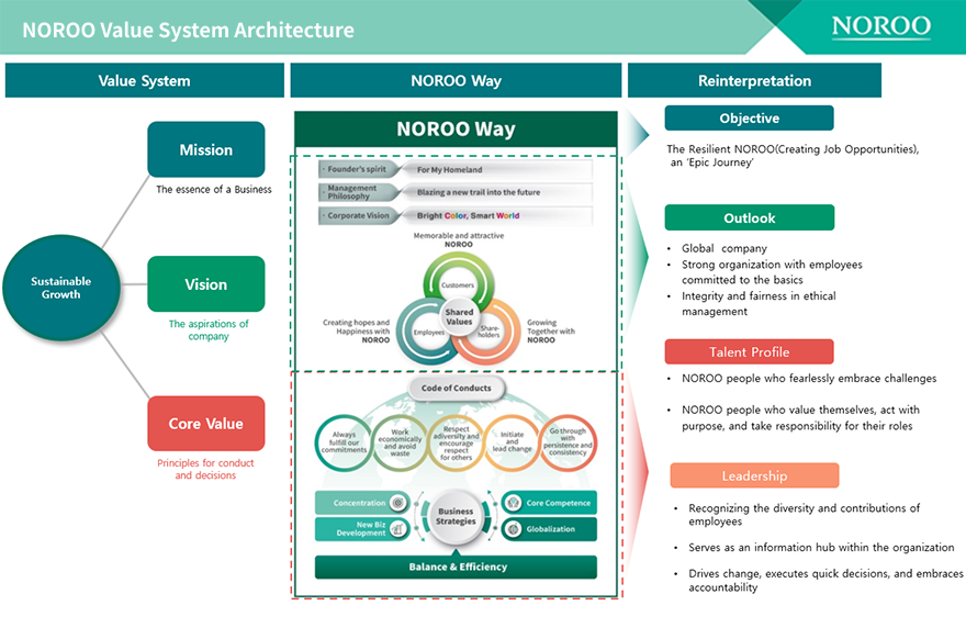• Since its establishment in 1945, NOROO has been guided by its founding spirit, "For my homeland" embedding various social values into its business practices to contribute to the growth and development of the nation. Even in challenging circumstances, NOROO has steadily upheld its commitment to creating quality careers. Moving forward, NOROO will remain dedicated to its core principles, practicing honest and fair ethical management as it continues to evolve into a global company.
